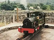In December 1929, a 4 ft 8+1⁄2 in (1,435 mm) standard gauge 0-6-0 diesel locomotive was obtained to work the Ravenglass-Murthwaite section. It was built by Kerr Stuart (works number 4421) and had a six-cylinder, 90 horsepower (67 kW), McLaren-Benz engine. Transmission was mechanical and final drive was by roller chains. In 1955 it was sold, through a dealer, to the National Coal Board for use at Wingate Grange Colliery, Durham. A new Dorman engine of 90 horsepower (67 kW) was fitted in 1960.[9] It is now preserved at the Foxfield Light Railway,[10] restored to original external condition, and was displayed at Ravenglass in the summer of 2000.