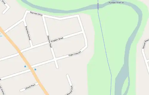 The area instead became residential, and by the mid-1950s, Raymore Drive was home to a mix of retirees and blue-collar workers. Near the intersection of Raymore Drive and Gilhaven Avenue, a footbridge was built over the Humber to facilitate travel to Weston's main commercial area.[2] At the time, Raymore Drive went from Scarlett Road, mostly along the Humber River, passing Brownlea Avenue, Waterton Road, Tilden Crescent, and Gilhaven Avenue. Raymore continued to follow the Humber on its right bank, and curved back to end at Gilhaven. Before the street curved south, only the south side of Raymore Drive had houses, while when the streets went north to south, homes lined both sides of the street.