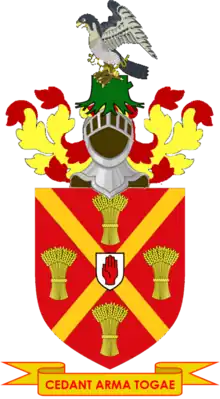 Arms: Gules a Saltire between four Garbs Or; Crest: On the Stump of a Tree Vert a Falcon rising proper belled and jessed Or; Motto: Cedant Arma Togae (May war give way to peace)[5]