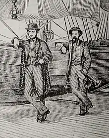 The crew which took the ship from Sandy Hook, New Jersey, to Margate, England, were Captain John M. Hudson and Mate Frank E. Fitch, along with Fanny the poodle.[17] The Red, White and Blue left New York on 9 July 1866, and arrived at Margate on 16 August.[3][18] Before the voyage, male New Yorkers were commenting: "The fools will never get across", "That captain ought to be tried for murder", and "They ought to be put in a lunatic asylum." Certain American newspapers commented, "One more lunatic weary of breath", or suggested that the ship's name should be "The Fool's Own". However Hudson noted in his log that, "The poor ladies, God bless them! were all praying for us." But Hudson wrote, "Let them all have their own opinions; I have mine."[1]