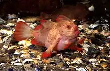 The red handfish is distinguished by its small, flattened wart-like protuberances that cover its body and red colouration. Two colour morphs exist, a bright red morph with red colour on both body and fins, with a black line separating the white fin edges and a mottled morph with pink body covered in many red patches, with translucent pink fins expressing some bright red patches. They measure an average standard length of 61.4 mm (2.4 in) and an average total length of 80.1 mm (3.2 in).[2] They use their hand-like fins to crawl rather than swim.[3]