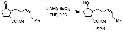 Many selective reductions of carbonyl compounds can be effected by taking advantage of the unique reactivity profiles of metal alkoxylaluminium hydrides. For instance, lithium tri-tert-butoxy)aluminium hydride (LTBA) reduces aldehydes and ketones selectively in the presence of esters, with which it reacts extremely slowly.[20]
