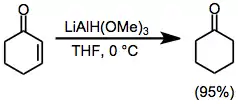 α,β-Unsaturated ketones may be reduced selectively in a 1,2 or 1,4 sense by a judicious choice of reducing agent. Use of relatively unhindered lithium trimethoxyaluminium hydride results in nearly quantitative direct addition to the carbonyl group (Eq. (9)).[21] On the other hand, use of the bulky reagent LTBA leads to a high yield of the conjugate addition product (Eq. (10)).[22]