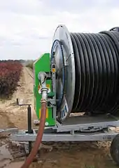 A reel is a device used to store elongated and flexible objects (e.g. yarns/cords, ribbons, cables, hoses, etc.) by wrapping the material around a cylindrical core known as a spool. Many reels also have flanges (known as the rims) around the ends of the spool to help retain the wrapped material and prevent unwanted slippage off the ends. In most cases, the reel spool is hollow in order to pass an axle and allow it to spin like a wheel — a winding process known as reeling, which can be done by manually turning the reel with handles or cranks, or by machine-powered rotating via (typically electric) motors.