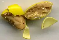 The developer of the project turned the problem over to a team of outside scientists, who created a peanut-flavored penuche filling.[17] More experimentation was needed to determine the correct thickness of the shell. Finally, the colors of the candy coating were designed to coordinate with the color of the Reese's package. The color distribution goal is 50% orange, 25% brown, and 25% yellow.[18]