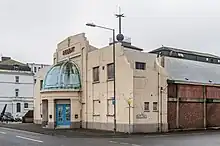 The pavilion was loss making and the owner, the borough council, were approached by businessmen Harry Carey and Henry Boyer who proposed to rent the structure and convert it to a cinema.[4] The conversion, Art Deco in style, was designed by Margate architect Percy Levett.[1][4] The works had a low budget but included the addition of a domed frontage, moving of the original stage, construction of a cafe and erection of a first floor extension to house the projection box and offices.[5][3] The cinema boasted 911 seats and was the largest in the town until the opening of an Odeon in 1936.[6]