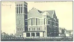 First Baptist Church on the corner of Victoria Avenue and Lorne Street, was opened in 1911 and its gold organ pipes first heard in 1912. The church was renowned for its large domed ceiling and chandelier. The Institute for stained glass in Canada has documented the stained glass at First Baptist Church.[54] The 1912 Regina "Cyclone" severely damaged the church but it was soon restored.[55] Unlike other imposing church buildings in downtown Regina and the East End,[56] First Baptist survives as a major landmark.