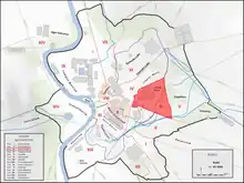 At the turn of the 5th century, the Regio was divided into 12 vici (districts) and 2,757 insulae (blocks). It had two curators and was served by 48 Roman magistrates.[5]