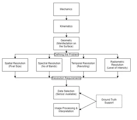 The sensor could be spaceborne (carried by satellite), airborne (carried by aircraft, or most recently Unmanned Aerial Vehicle (UAV)) or ground-based (sometimes called proximal sensing).[8] Data acquired from higher elevation captures a larger field of view/ spatial coverage, but the resolutions are often lower.[9] Prior mission planning regarding flight path, weight load, carrying sensor etc. have to be done before deployment.[8] The resolution requirement is often high in geological studies, hence airborne and ground-based systems prevail in surveying.[8]