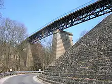 The line has grades from Plaue of 1:50 to 1:70 and sections with radii of only 300 m as it passes through a genuine mountain range. The largest bridge on the line is the Marien bridge near Plaue. It spanned former federal highway 4 at line-kilometre 15.9. The biggest bridge on the line is the arched viaduct in Angelroda. It is 26.5 m high, 100.4 m long and consists of three spans. 253 t of steel were used for the bridge. It was built in a very innovative way as a projected bridge supported by auxiliary scaffolds. For this purpose, the individual sections of the bridge were mounted on the projections of the viaduct and moved over the bridge piers by being hauled by cable.[8] The position of the entire bridge on a sharply curving track made this bridge construction difficult and also posed a challenge for the designers. A curiosity is also the construction of the retaining walls at the bases of the bridge piers. Here, the supporting walls were not inclined, as is normal custom, but were stepped instead. It is not known why the greater and self-reinforcing stability of a sloped retaining wall was not used. The original steel lattice structures of the two piers were covered in concrete in 1905 to increase their load bearing capacity. In contrast to the steel pillars, the rebuilt concrete bridge piers were again designed to receive the superstructures for a second track that was never installed. On the new, wider piers, a new, stronger bridge was built parallel to the existing bridge and the track was swung onto it and the old superstructure, with the exception of the old bridge deck, which was cast in place, was demolished. Since then the eastern side of the piers has been undeveloped. The masonry structure of the bridge piers is deceptive and has only a visual character. In fact, the pillars are not brick, but are cast in mass concrete.