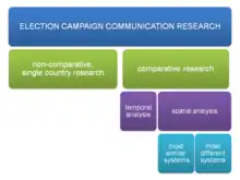 Political communication, and as a subfield of it election campaign communication, is studied within several disciplines of social sciences including communication studies, political science, psychology as well as sociology. Research across disciplines leads to the development of a variety of different research methods. In the past scholars mainly examined single countries, i.e. conducting non-comparative, case studies. Comparative election campaign communication research arrived in the 1970s.[20] In contrast to simple observation, which was historically used as research method to reveal how political communication is received and which consequences result, today, study methods are more deliberate and systematic.[21] Quantitative approaches, e.g., include the formulation and testing of hypotheses by sophisticated statistical analyses. Due to the development of new campaign techniques, such as party-controlled digital and data campaigning, or online news coverage, research strategies need to be further adapted.