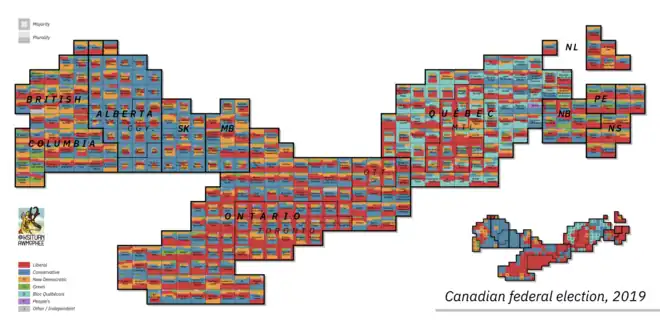 Campaign strategy was weak in most of the political parties. As one commentator remarked, "Never before have both major parties taken such a small share of the vote. Never before, in my memory, have both declined steadily and together throughout a campaign."[2] While the Conservative share of the vote rose from 31.9 percent in 2015 to 34.4 percent in 2019, and saw its share of the popular vote rise in 194 of the ridings, its share of the vote fell In the remaining 144.[lower-alpha 1][3] The Liberals emerged from the election with a strategic advantage in seats in both Ontario and Quebec, and the Conservatives' weakness on election day may lead to questions about the future of its leader Andrew Scheer,[4][5] but there is also discussion as to whether the Tories' shortfall is due to more systemic reasons,[6][7][8] especially with respect to the urban/rural divide in the electorate.[9]