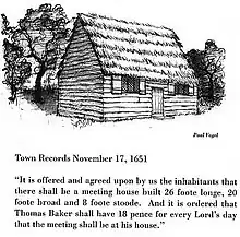 Rev. James's house was located next to the Gardiner house on what is now James Lane. The Meeting House, where Rev. James preached, was also located on the same property, which is now the South End Cemetery. The cemetery was originally the South End Burying Ground, and it was connected to the church or Meeting House. The whole area was fenced in for protection.[8] Rev. James also interacted with the local Native American population, the Montauks. He learned the Indian language and taught them the English language. The Indians sometimes even worshiped with him. The friendly relationship between the colonists and the Native Americans is in part what led the Sachem Wyandanch to consider an alliance with the town.[9]