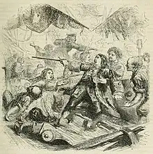 Carter took part in the Battle of Barfleur on 19 May. At the beginning of the action a light wind kept the Blue squadron some distance to leeward, and hopelessly out of the fight; but towards the afternoon a shift of wind permitted it to lay up to the enemy, and eventually to get to windward of them, thus placing them between two fires.[5] By about 6 p.m. Carter in the Duke and the rest of his ships were engaged with the enemy as the tide carried them among the French.[1] There was for a short time some sharp fighting,[5] in which Carter lost a leg.[1] He was struck by a splinter of one of his own yardarms, and fell dying on the deck. He would not be carried below. He would not let go his sword. "Fight the ship", were his last words: "fight the ship as long as she can swim".[8] He died of his wounds at 10 p.m.[1]