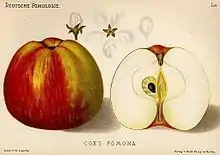 In 1830 he planted pips[4] in his orchard[5] Satisfied with the quality of the fruit produced by two of his seedlings, in 1836 he supplied grafts to E. Small & Son, the local nurseryman who offered the first trees for sale in 1840.[6] The two varieties, Cox's Orange Pippin and Cox's Pomona, remained mostly unknown until Charles Turner of the Royal Nurseries in Slough, impressed by their quality, began to offer them in his catalog in 1850.[7] Other English nurserymen began to graft and sell Cox's Orange Pippin trees, and by 1883 it was one of the most popular apples in the country.