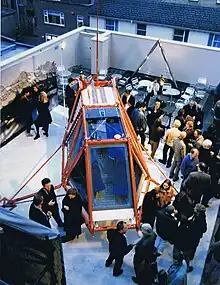 Ski Haus was conceived while skiing late and high in the Alps: evening sun, a beautiful, clear, starlit night, twinkling lights of the village in the valley, a reluctance to return: Would it be possible to stay here in the beautiful, cold silence? The SkiHaus serves as a mobile alpine hut or a ‘hard tent’. The lightweight, all-aluminium structure weighs only 315 kg and is designed to be lifted into position by helicopter. It is well-insulated using lightweight aviation materials and has a self-sufficient energy system powered by solar and wind generators. Since 1992 the SkiHaus has been tested by the team together with mountain guides and helicopter engineers at varying altitudes in the Swiss Alps up to 3901m (next to the ‘Kleines Matterhorn’). It will be used further by the local mountain guide centres for ski touring, climbing, guide training, ski races and medical positions. Besides its rescue and safety functions, the SkiHaus is an architectural vehicle with which to explore the third dimension and the wide clear spaces on top of the mountains. It has been situated on the Swiss-Italian ridge close to the ‘Kleines Matterhorn" since May 2004 and is currently used as shelter and accommodation for skiers and climbers.[3]