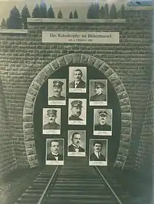 A later attempt from Kaltbrunn to reach the accident site with a rescue train also failed. Only after 8 PM, with the help of a handcar, respirators, and oxygen masks, were they able to reach the accident site from Kaltbrunn.[1] By that point, recovery work was no longer hindered by smoke and gas. The train crew and the two rescuers from Wattwil were found dead, raising the death toll to nine. The victims were found lying or sitting in the wagons. Two of the victims were found outside of the train, in alcoves in the tunnel. One of the deceased rescuers from Wattwil had apparently tried to contact the station using the tunnel telephone.[3] When the rescue team arrived, the train's kerosene lanterns were still burning, but the briquettes on the grate had burned out.[4]