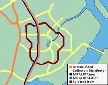 There are several ring roads in Singapore which aid relieving congestion on arterial road running through a town or area. These rings roads are usually served by a feeder bus service or complemented by a Light rail line, such as the Bukit Panjang LRT in Bukit Panjang.