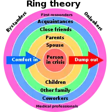 Ring theory is a concept or paradigm in psychology that recommends a strategy for dealing with the stress a person may feel when someone they encounter, know or love is undergoing crisis.[1] The concept, developed by clinical psychologist Susan Silk, advises those surrounding a person in crisis to direct expressions of their own feelings of stress toward those less close to that person and direct only support toward those closer to the person, using a diagram of concentric circles to illustrate the concept.
