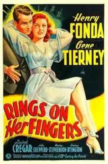 Rings on Her Fingers is a 1942 American comedy film directed by Rouben Mamoulian and starring Henry Fonda and Gene Tierney. The screenplay concerns a poor man who gets mistaken for a millionaire and is swindled out of his life savings.