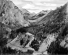The "Ophir Loop", circa. 1910. The tracks above led to Rico, the tracks below lead to Vance Junction.