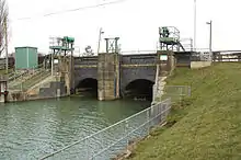 In 1734, John Grundy, one of the pioneers in applying scientific principles to the solution of civil engineering problems, was asked by the Adventurers of Deeping Fen to consider the drainage of 47 square miles (120 km2) of fenland to the west of Spalding. His plans included the construction of a reservoir which covered 10 acres (4.0 ha), impounded by a sluice at Surfleet. At low tide, the water would be released, and the scouring action would deepen the channel, with a consequent improvement in drainage. Humphrey Smith directed the construction, with Grundy acting as engineer, which was completed in 1739, according to a plaque fixed to it at the time. The sluice had three openings, each 8 feet (2.4 m) wide, with pointed doors on the downstream site, which closed as the tide rose, and lifting gates on the upstream side, which would be raised to discharge the water.[14] The present sluice was erected by the Trustees of the Deeping Fen Drainage Act, 1856. The first stone was laid by Lord Kesteven on 17th February 1879 and the sluice opened in November 1879 at a total cost of £15,000.