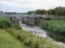 Some 20,000 people live in regions of Lincoln that are susceptible to flooding. Most of the city's industrial buildings and around half of the commercial property is also at a high risk from flooding.[11] There were major floods in the city in 1947 and 1958, and the amount of water delivered to the city by the River Till was a significant factor in the 1958 floods.[12] Following these events, feasibility studies were carried out in 1977 to identify ways to mitigate flooding in the city. This resulted in the construction of two washlands, one where the River Brant joins the River Witham, to the south of Lincoln, and the other on the River Till, to the north-west. Work began in 1984, and the two schemes can hold back 340 million cubic feet (9,600 Ml) of floodwater. In both cases, a shallow embankment was constructed across the river valley, and the river passes through a control sluice, which can be used to limit the volume of water travelling downstream. Inlet and outlet sluices in the embankments can be opened to allow the water to flood the Till washlands, rather than allowing river levels in the city to breach the defences.[7] The water from the washlands is subsequently released as levels through the city return to normal. Draining of the washlands is assisted by pumping stations, and the scheme was completed in 1991.[11]