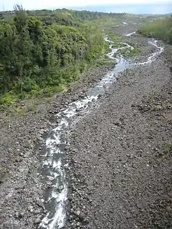 The Rivière de l'Est flows down the slopes of the Shield volcano Piton de la Fournaise from an elevation of 720 metres (2,350 ft) above sea level.