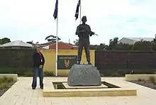 ![]() Hitchcock standing next to one of his (larger than life) figures at the SAS Garden of Reflection, Perth, Western Australia | |