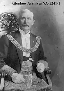 Robert Patterson was born in Tipperary, Ireland on April 11, 1855 to George and Mary Patterson. Patterson immigrated to Canada at the age of 21 and joined the North-West Mounted Police in 1876 and dispatched to Fort Macleod.[1] Patterson began ranching in 1880 in Slide, Ontario and bought out his partner in 1884.[1] Patterson served on Fort Macleod town council and a member of the school board for a number of years.[1]