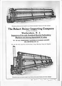 A photo taken circa 1903 shows an advertisement for the Robert Reiner Importing Company on the side of a horse-drawn wagon.[5] This would have been typical of the technology at that time. But, this would quickly change. Many Swiss and Germans immigrated to Hudson County at the beginning of the century, and helped to build the industry there. They brought knowledge of the machines, and the methods that were necessary to produce embroidery and lace. Ancillary businesses that supplied fabrics, thread, embroidery designs, “punching” or translating of designs to Jacquard punch tapes, dying, chemical lace etching, and bleaching of so-called "white goods" also developed in New Jersey. This network of interdependent businesses mirrored the industries in Switzerland and Germany. Reiner's connection to VOMAG enabled him to become the sole importer of their machines The machines were manufactured in Germany at the VOMAG factory and then assembled in New Jersey. Reiner imported semi-automated schiffli machines which used a pantograph as well as fully automated schiffli machines which were programmed using a Jacquard punch card reader. He also imported punching machines which were used to encode the design onto the schiffli punch cards. The 1917 advertisement at right shows 10 and 15 meter schiffli embroidery machines. Fifteen meter machines were state of the art at that time.
