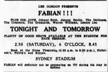 Rock 'n' Roll is a 1959 Australian film directed by Lee Robinson. While often referred to as a documentary, it is essentially a complete filming of a rock concert held in October 1959, at Sydney Stadium. The film was commissioned by Lee Gordon to promote a string of 1959 shows entitled Lee Gordon's 1959 Rock'n'Roll Spectacular, mainly showcasing Australian and New Zealand artists. While the show was largely based around native talent, the headline act was the American singer and pop idol Fabian.