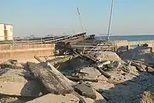 On October 29, 2012, Hurricane Sandy destroyed much of the Rockaway Boardwalk.[121] The most impacted parts of the boardwalk were between Beach 80th and 106th Streets, where some planks were tossed into nearby houses. In the aftermath of the hurricane, several entities disagreed over how the wood should be reused.[11] Michael Bloomberg, the New York City mayor at the time, announced in December 2012 that the boardwalk would be rebuilt in concrete rather than wood. Four of the concrete sections that had been rebuilt before the hurricane had suffered relatively little damage compared to the wooden sections, which were almost completely destroyed.[122] The wooden boardwalk between Beach 9th and 60th Streets, a 2.5-mile (4.0 km) stretch, was also relatively undamaged, except for a four-block gap between Beach 35th and 39th Streets. The beach was also depleted, although many Rockaways residents had stated that, for several years before Hurricane Sandy, the beach had been eroding slowly.[123] Sand from the beach had landed on people's yards and on nearby streets, while personal property had been tossed onto the shore.[124]