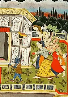Krishna, the eighth child of Devaki, was exchanged with the daughter of Nanda and Yashoda in secrecy. Yashoda (foster-mother of Krishna) and Rohini play an important nurturing Krishna and Balarama in their childhood.[6]