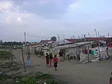 Albanians regarded these acts as further evidence that Roma had allied themselves with the enemies of the Albanian nation, and thus many Roma were targeted by the returning Albanians.[5][7] The departure of the Yugoslav army and police was followed by a series of "retaliatory attacks". By June 1999, the Romani mahala of Mitrovica was burned down and the inhabitants fled. Around 3,500 Roma took shelter in a school in Kosovo Polje following threats and the Roma community of Gjakova were warned to leave their homes. The Romani quarter of Brekoc in Gjakova and Dusanova in Prizren were also burned down.[8] German KFOR troops also discovered 15 severely beaten Roma, accused of taking part in looting and collaborating with the Serbs, in a police office in Prizren that was being used by the KLA as a prison.[5][9] 5,000 displaced Roma gathered in a KFOR built camp in Obilić where they were subject to insults and attacks by Albanians.[5]