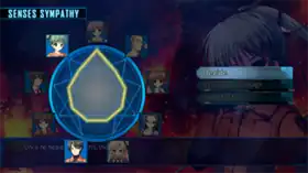 An essential component in the game is the "Senses Sympathy System" ("SSS"). Throughout the game, the player is given a chance to adjust their impressions ("Senses") of the characters (including the characters that they are taking the role of) using sliders. The SSS is based on the Enneagram of Personality, with each of the main characters of the story representing one of the nine different types.[2] At scenes where the player is allowed to give their input - referred to as "branches" - the enneagram figure will show up on the screen; however, only characters that are relevant to the scene can have their Senses be adjusted. How the player interacts with the SSS at the branches directly influence the progress of the story.[3][4] When the enneagram figure shows up, the color surrounding the outline of the graph signifies the importance of the player's input. There are three different colors: blue, yellow, and red. Blue are branches that can influence a character's overall favor but are generally not important to the story; however, skipping too many blue branches can be detrimental later on. Yellow are branches that affect a character's actions and change how the story advances. Finally, red are branches in which deciding incorrectly will lead to an undesirable outcome, making the inputs at these branches critical.[2]