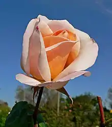 'Michele Meilland' is a medium bushy, upright hybrid tea rose, 3 to 5 ft (0.91–1.52 m)in height, with a 2 to 3 ft (0.61–0.91 m) spread. It has a double (17-25 petals) bloom form. Bloom size is 4 in (100 mm). The flowers are light pink with a hint of salmon or copper toward the center, and lighter transparent pink toward the edges. Beautiful and slender, yellow-orange buds, open to a pale pink rose with hints of orange. The flowers are elegantly shaped, both as slender buds and open blooms, and are their prettiest in the autumn. The plant does best in cooler climates.[1] It has medium green, healthy leaves.[2][3]
