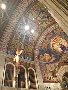 The nave of the cathedral is topped by a barrel vault that is divided into seven bays and elaborately painted with figures from both the Old and New Testaments executed by artist Felix Lieftuchter. The paintings use the Keim process which utilizes mineral paints that does not evaporate or interfere with acoustics. Each bay holds a triple window measuring 26 ft (7.9 m) high and 8 ft (2.4 m) wide. Along the nave are altars dedicated to St. Theresa of Lisieux and Our Lady of Perpetual Help.