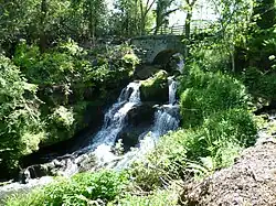 The glen has many of the typical features of an Edwardian urban park, such as a boating pond started in 1923 by Sir Robert McAlpine to replace a former curling pond. Rouken Glen includes a large waterfall on the Auldhouse Burn surrounded by steep woodland; the waterfall is based on a natural waterfall, doubled in height to form a reservoir to supply the printworks downstream at Thornliebank during the early 19th century. There is a walled garden in the grounds of the former manor, Thornliebank House (demolished 1965).[5]
