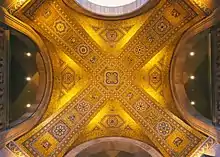 The eastern wing facing Queen's Park was designed by Alfred H. Chapman and James Oxley. Opened in 1933, it included the museum's elaborate art deco, Byzantine-inspired rotunda and a new main entrance. The linking wing and rear (west) façade of the Queen's Park wing were originally done in the same yellow brick as the 1914 building, with minor Italianate detailing. However, the Queen's Park façade of the expansion broke away from the heavy Italianate style of the original structure. It was built in a neo-Byzantine style with rusticated stone, triple windows contained within recessed arches and different-coloured stones arranged in a variety of patterns.[31] This development from the Roman-inspired Italianate to a Byzantine-influenced style reflected the historical development of Byzantine architecture from Roman architecture. Common among neo-Byzantine buildings in North America, the façade also contains elements of Gothic Revival in its relief carvings, gargoyles and statues. The ornate ceiling of the rotunda is covered predominantly in gold back painted glass mosaic tiles, with coloured mosaic geometric patterns and images of real and mythical animals.