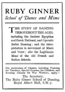 Ginner founded the Ruby Ginner School of Dance in London during World War I.[8] She later partnered with mime Irene Mawer, and the school was known as the Ginner-Mawer School of Dance and Drama.[4][9] Among her students was Australian health advocate Thea Stanley Hughes, Canadian dancer Gweneth Lloyd,[10] actress and dancer Irene Mulvany-Gray[11] (and her sister Hilda Mulvany-Gray)[12] and dance educator Beatrice "Bice" Bellairs.[13] She taught movement to actors at Constance Benson's studio, including a young John Gielgud.[14]