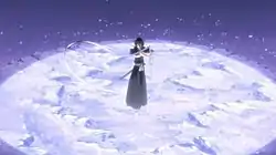 During Rukia's bid for freedom, she is stopped by Sōsuke Aizen and his accomplices. Aizen, having singlehandedly orchestrated Rukia's execution, reveals to her that within her soul is stored the Hōgyoku ("breakdown sphere"), a powerful artifact created and placed there by Kisuke Urahara that gives hollows Soul Reaper powers and vice versa. Wanting the Hōgyoku for himself, Aizen hoped that her death would give him access to it, but settles for a nonfatal alternative.[21] The Hōgyoku is removed from her body, Aizen and his men flee Soul Society, and Rukia is acquitted of all charges.[22] With the Hōgyoku, Aizen is able to create an army of arrancar, which he uses to attack Ichigo and his friends once they return to the human world. Rukia and a group of other Soul Reapers are sent to assist in fighting the arrancar,[23] though after Aizen captures Orihime Inoue they are recalled to Soul Society.[24] Rukia's zanpakutō, Sode no Shirayuki (袖白雪, literally "Sleeved white snow"),[25] is also revealed as a completely white blade, earning it the recognition as the most beautiful zanpakutō in Soul Society.[26] Sode no Shirayuki utilizes ice to attack, each of its abilities being labeled as "dances" by Rukia.[25][27] During the anime's 13th season, Sode no Shirayuki manifests in a yukionna-like form, voiced by Mie Sonozaki.[28]