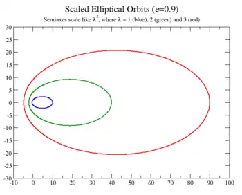 The direction of A is preserved as well, since the semiaxes are not altered by a global scaling. This transformation also preserves Kepler's third law, namely, that the semiaxis a and the period T form a constant T2/a3.