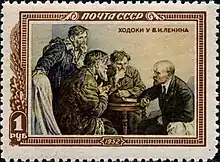 A group of khodoki (petitioners) come to make a request of Lenin; such meetings were often depicted in propaganda stories about Lenin, and in jokes making fun of such stories.