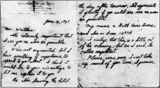 On June 14, 1949, the Phillies came to Chicago to face the Cubs; Waitkus played in the game, recording a hit and scoring two runs.[13] After the game, which she attended, Steinhagen sent Waitkus a handwritten note through a bellboy, inviting him to visit her in her 12th floor room in the Edgewater Beach Hotel where they were both registered.[14] Claiming to be "Ruth Anne Burns," Waitkus opened her note:[15]