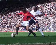 Van Nistelrooy looked set to complete a club record £18.5 million transfer to Manchester United in the summer of 2000.[16] He was to be unveiled at a press conference four days later, but this was instead used to announce that the transfer had been postponed over concerns about his fitness, having not played for a month due to problems with his knee.[17] The transfer was then cancelled after PSV refused to agree to further medical tests,[18][19] and the next day he suffered a rupture to his anterior cruciate knee ligaments during a training session, leaving him injured for a year.[20][21]