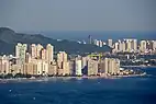 São Vicente is located on the western half of coastal São Vicente Island, being mostly a bedroom community for the larger and wealthier neighbouring port and commercial city of Santos on the island's eastern half.[6] A small north–south hill range separates for the most part the two cities' urban areas, but they are contiguous in the north and on a narrow beach strip in the south. A narrow strip of land of the basin of the small Cubatão River extends west out of the central area of São Vicente, north and parallel to the municipality of Praia Grande.