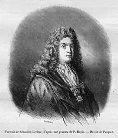 Sébastien Leclerc or Le Clerc ([baptized] 26 September 1637— 25 October 1714) was a French artist from the Duchy of Lorraine. He specialized in subtle reproductive drawings, etchings, and engravings of paintings; and worked mostly in Paris, where he was counseled by the King's painter, Charles Le Brun, to devote himself entirely to engraving.[1] Leclerc joined the Académie Royale de Peinture et de Sculpture in 1672 and taught perspective there.[2] He worked for Louis XIV, being made "graveur du Roi" (attached to the Cabinet du Roi), doing engraving work for the royal house. Leclerc also engaged in periodic work as a technical draftsman and military engineer.