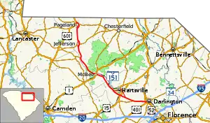 SC 151 starts in Pageland, splitting off from US 601 to bypass the town's business district. Heading southward, it also bypasses Jefferson, heads through downtown McBee, and bypasses Hartsville. In downtown McBee, the speed limit is 25 MPH, and on several segments of the route, the limit is 60 MPH. Past McBee, the route takes on a more east-west direction, which it maintains until its southern terminus in Darlington.[3]