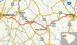 South Carolina Highway 252 (SC 252) is a 35.711-mile-long (57.471 km) state highway in the U.S. state of South Carolina. The highway connects the Anderson and Laurens areas with Honea Path and Ware Shoals. It has a unique feature in that it intersects U.S. Route 76 (US 76) three times along its length.
